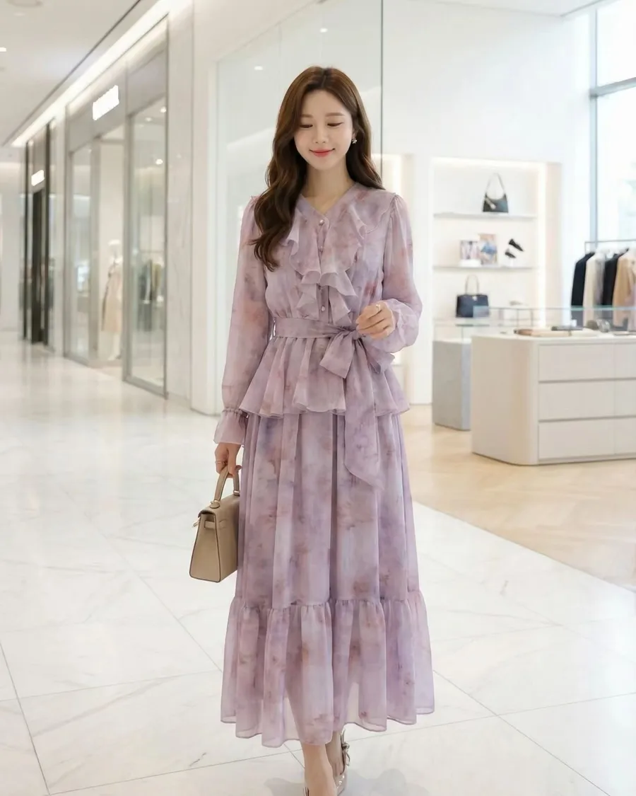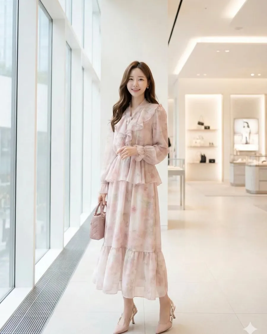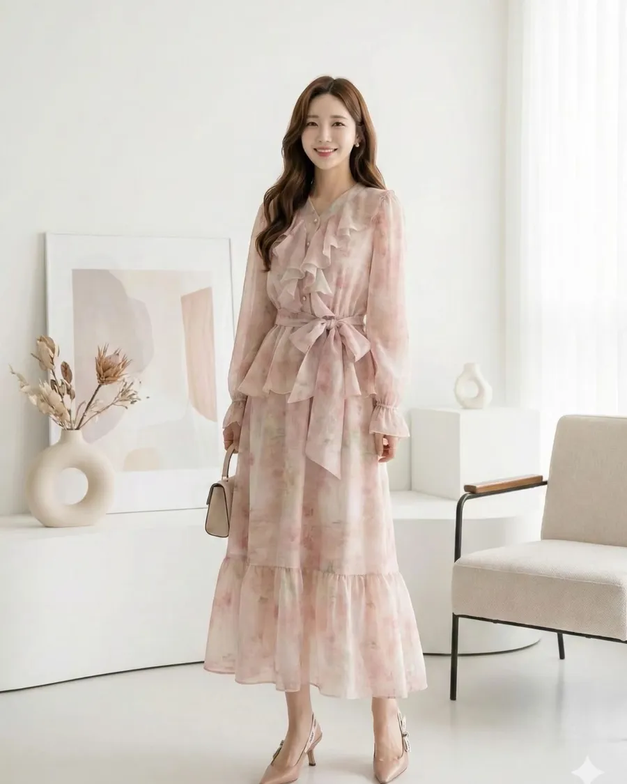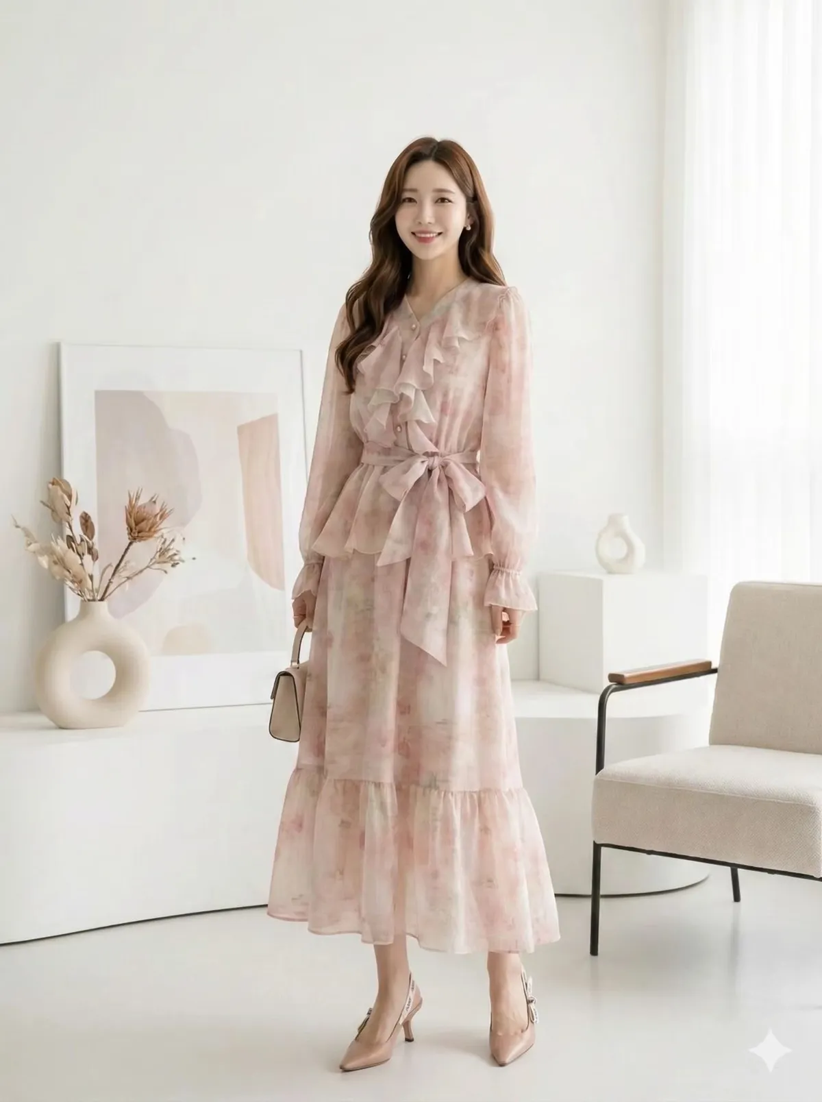 柔粉印花搭配蝴蝶結領口修身腰線飄逸裙襬展現溫柔知性氣質日常約會皆宜穿著舒適好看款