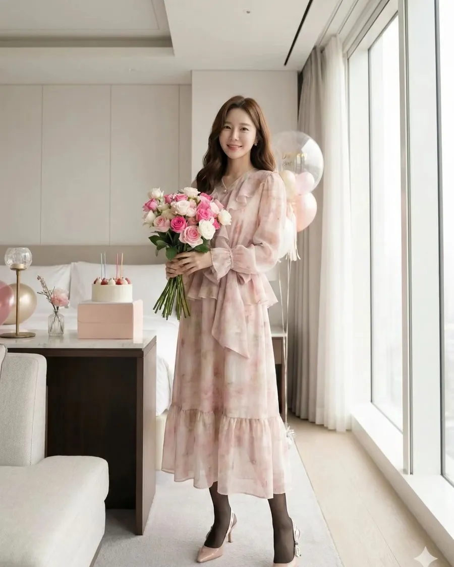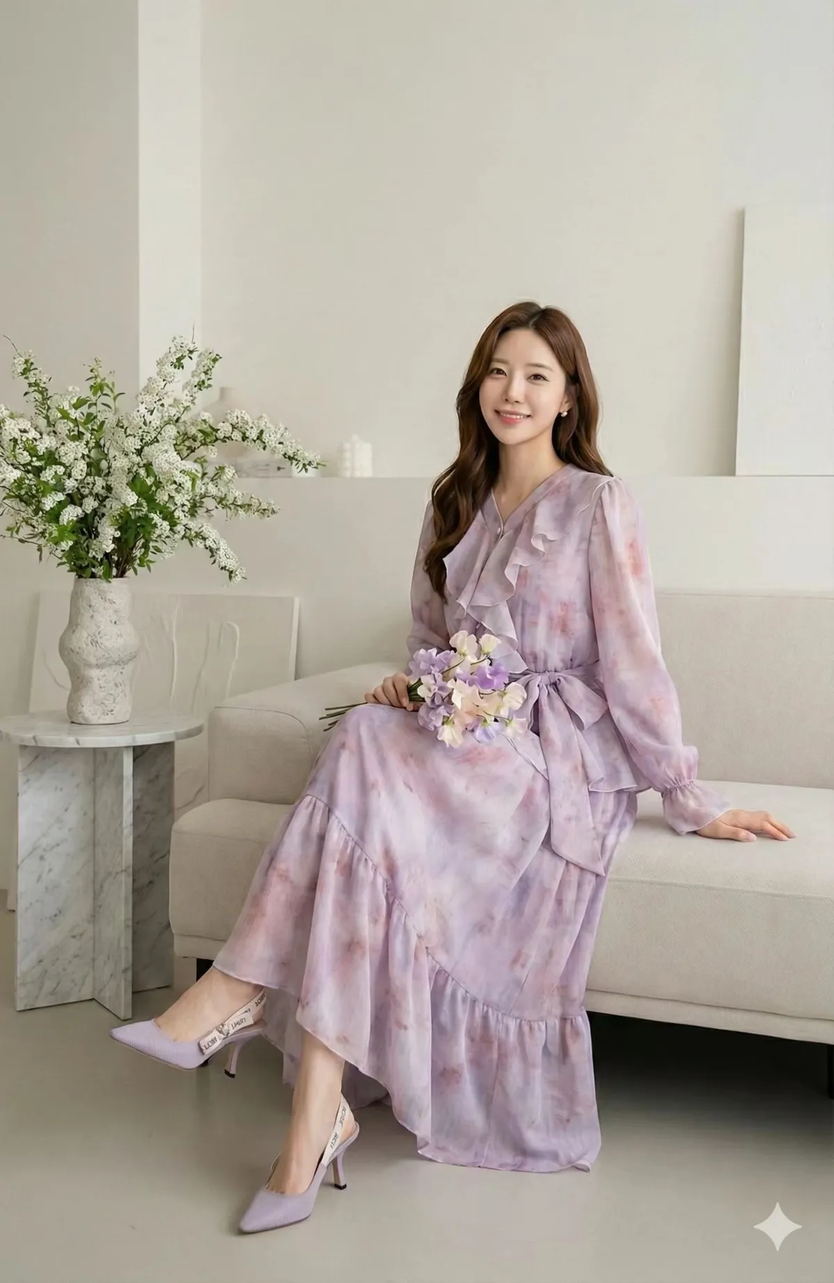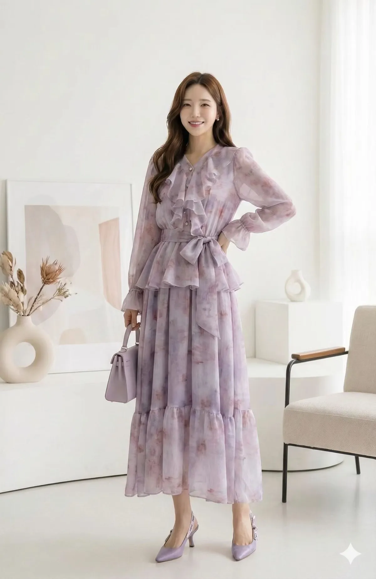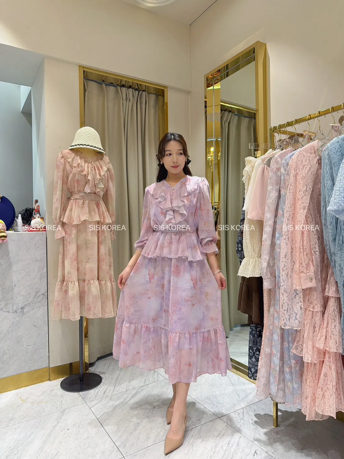 柔粉印花搭配蝴蝶結領口修身腰線飄逸裙襬展現溫柔知性氣質日常約會皆宜穿著舒適好看款