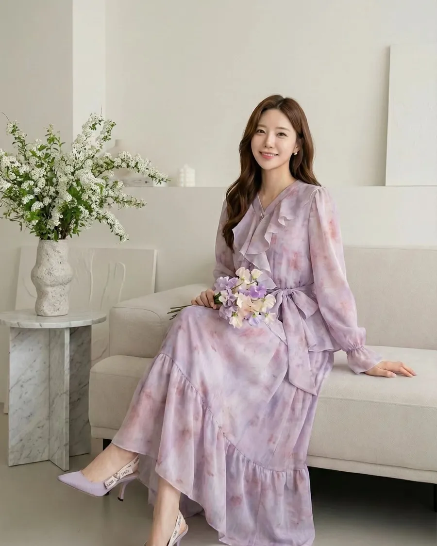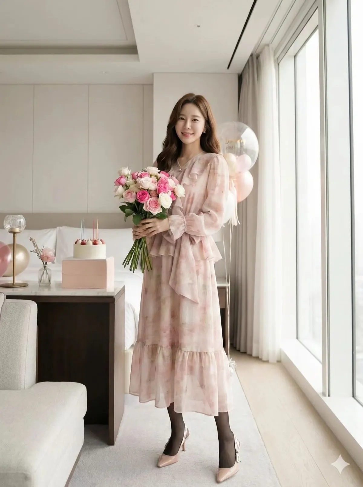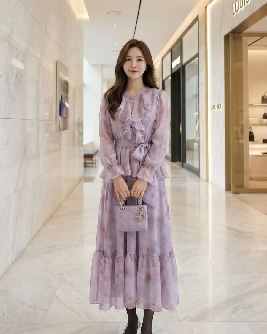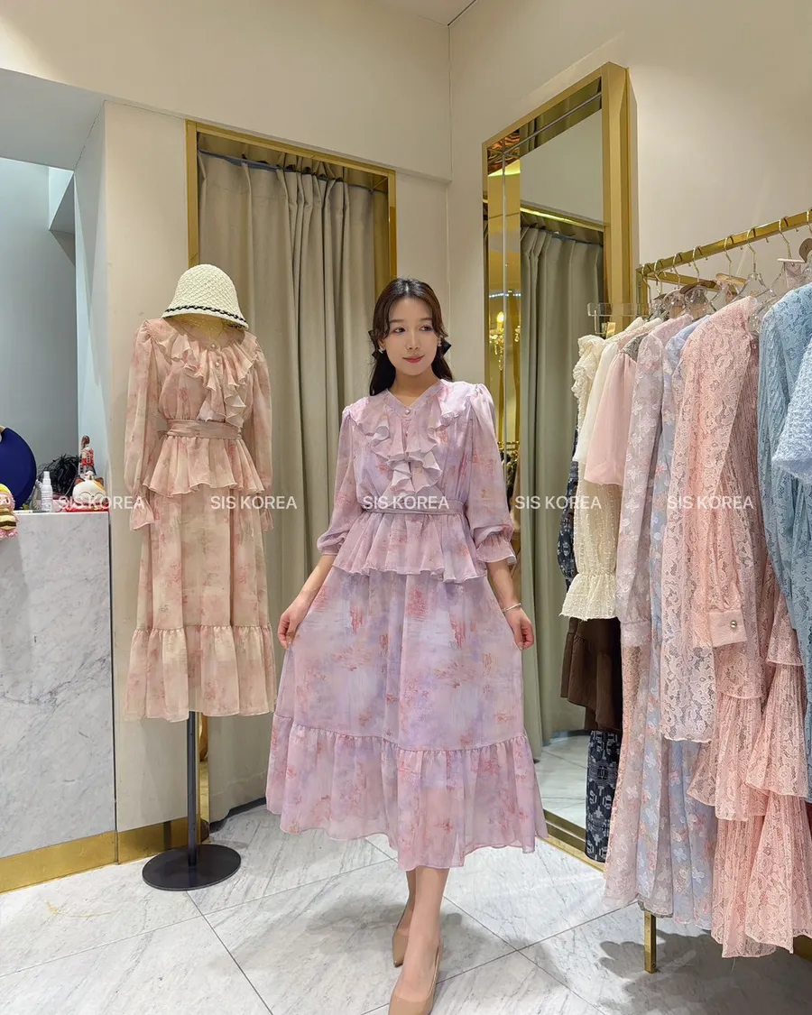 柔粉印花搭配蝴蝶結領口修身腰線飄逸裙襬展現溫柔知性氣質日常約會皆宜穿著舒適好看款