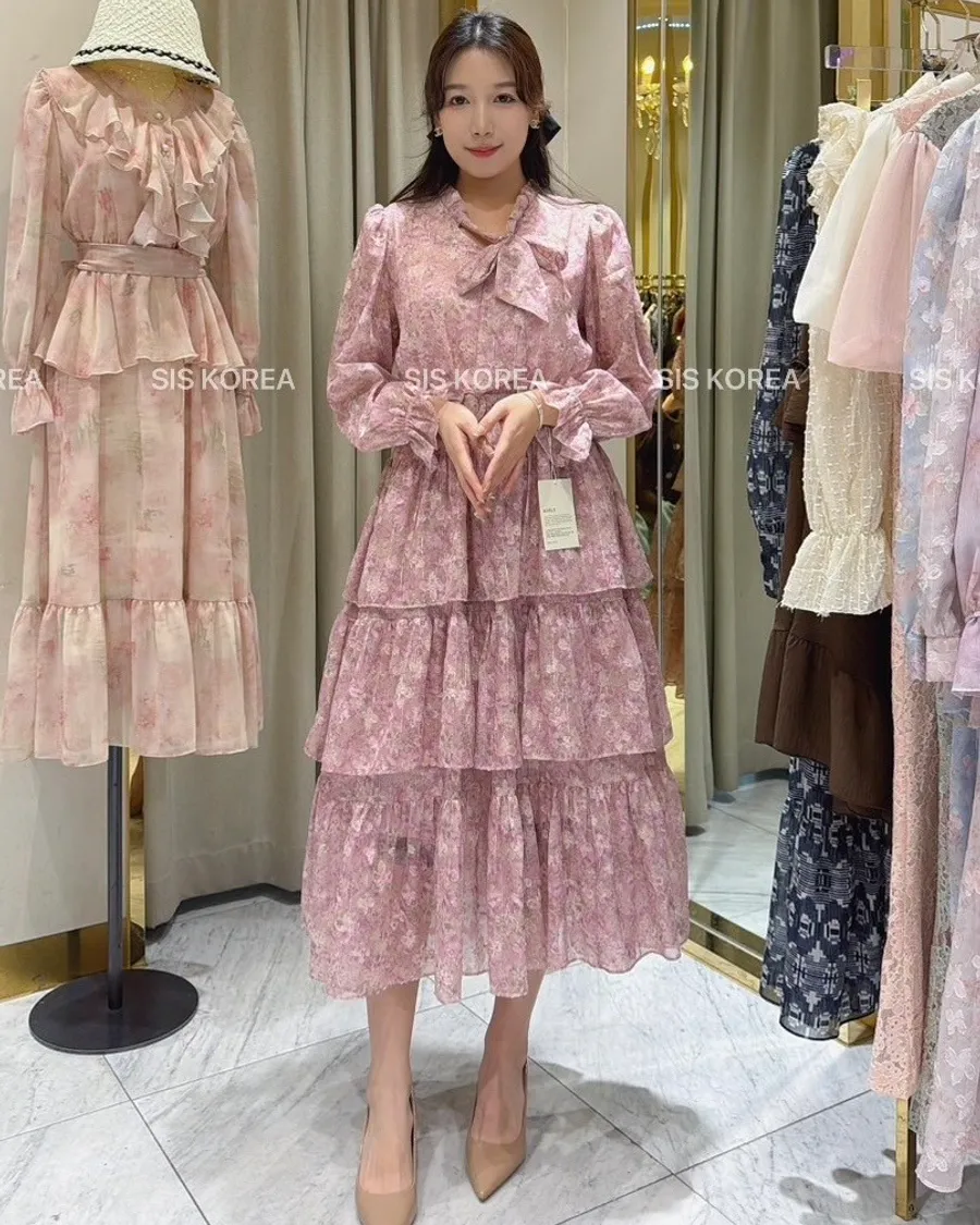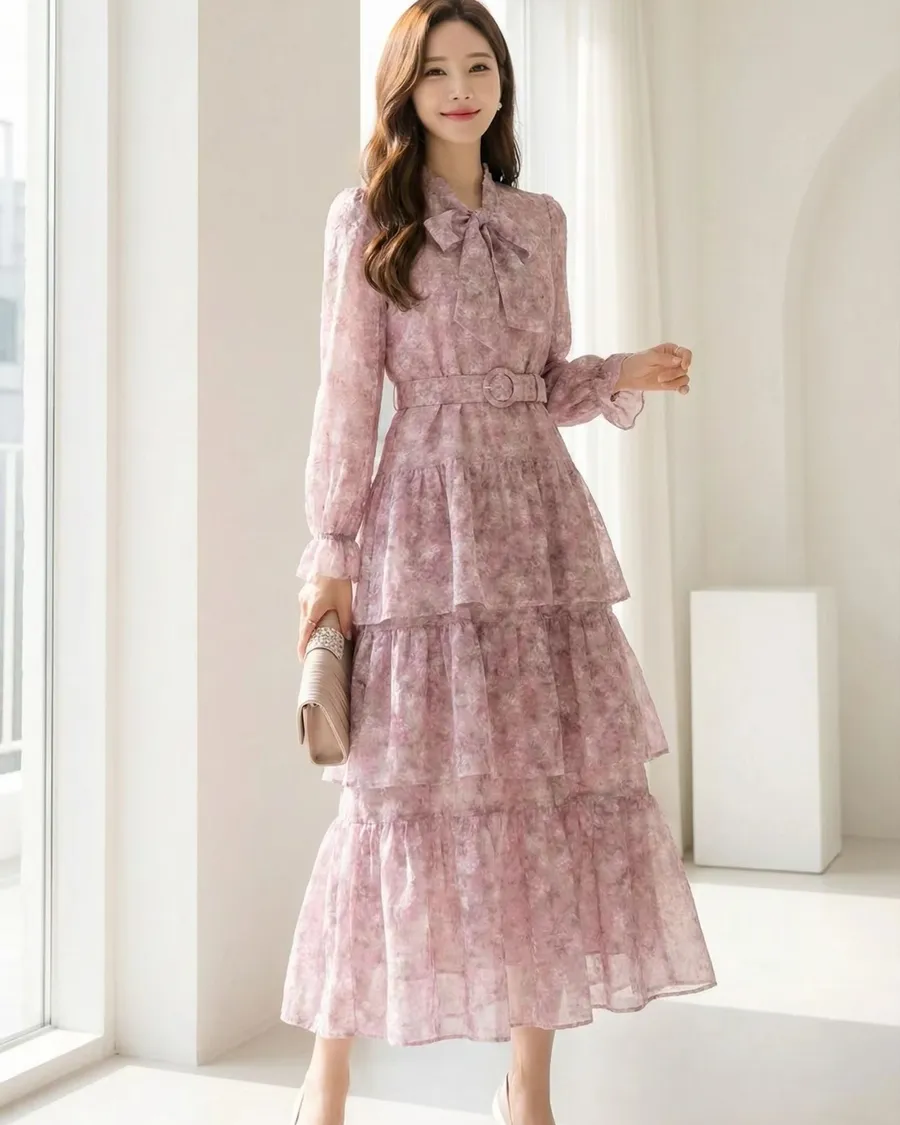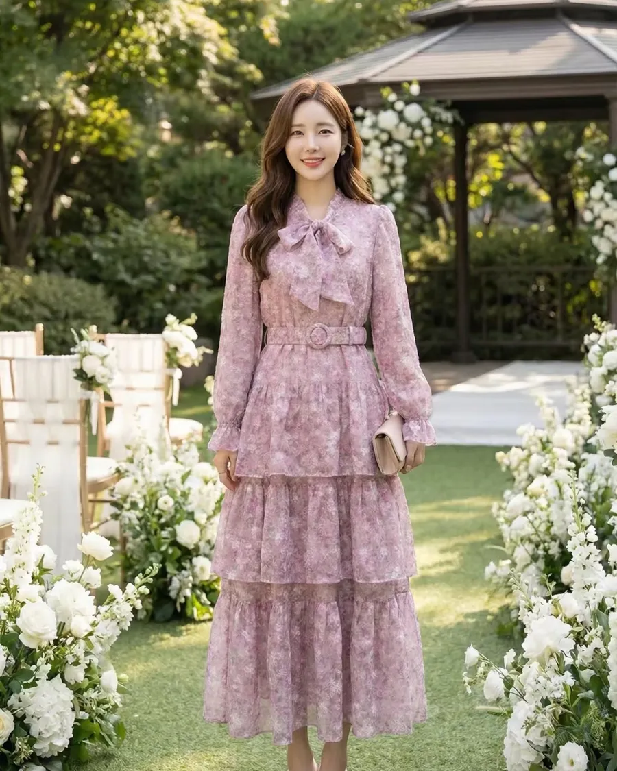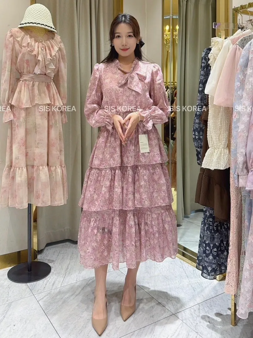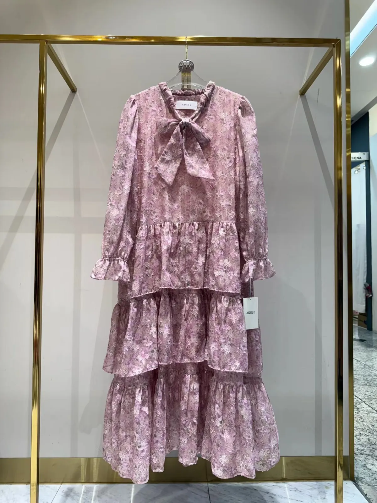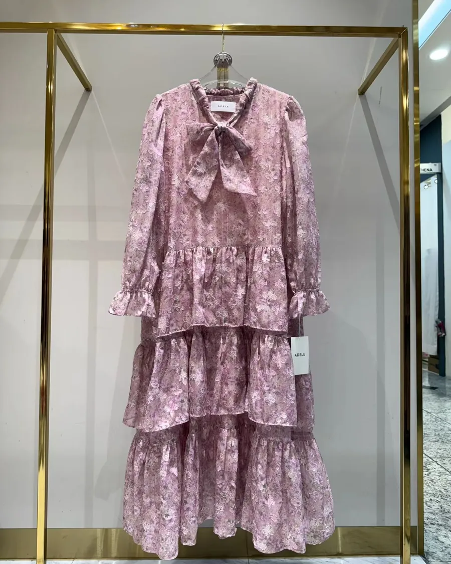 霧粉花影蝴蝶結蕾絲蛋糕連衣裙
