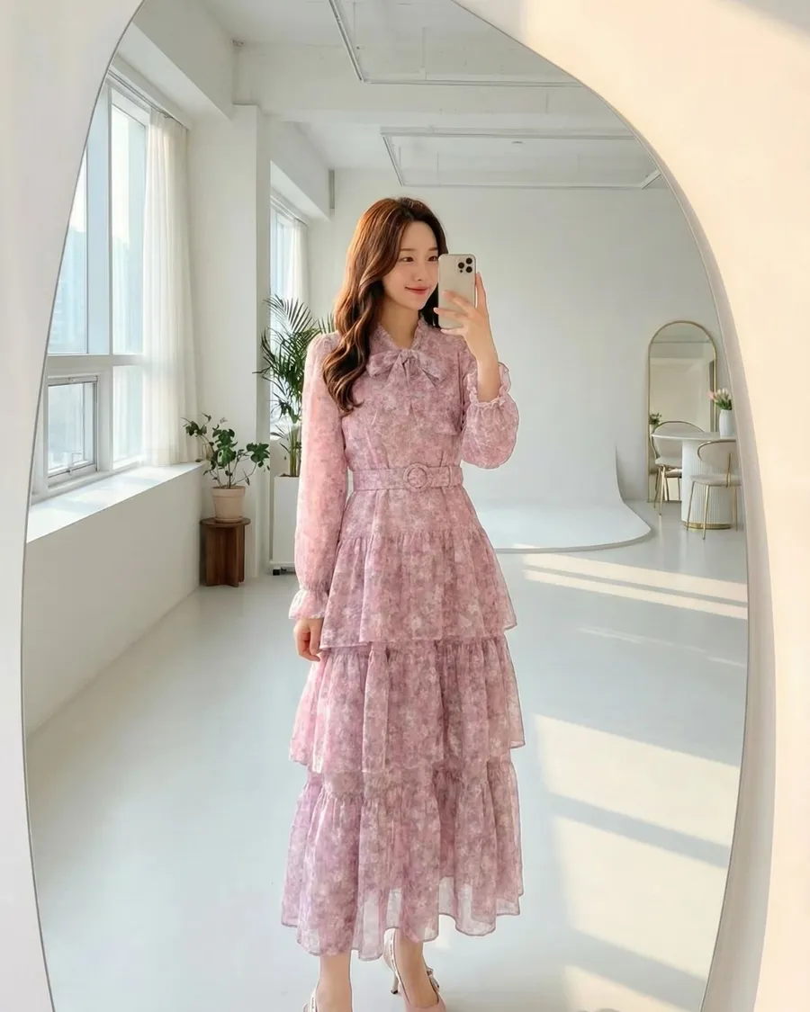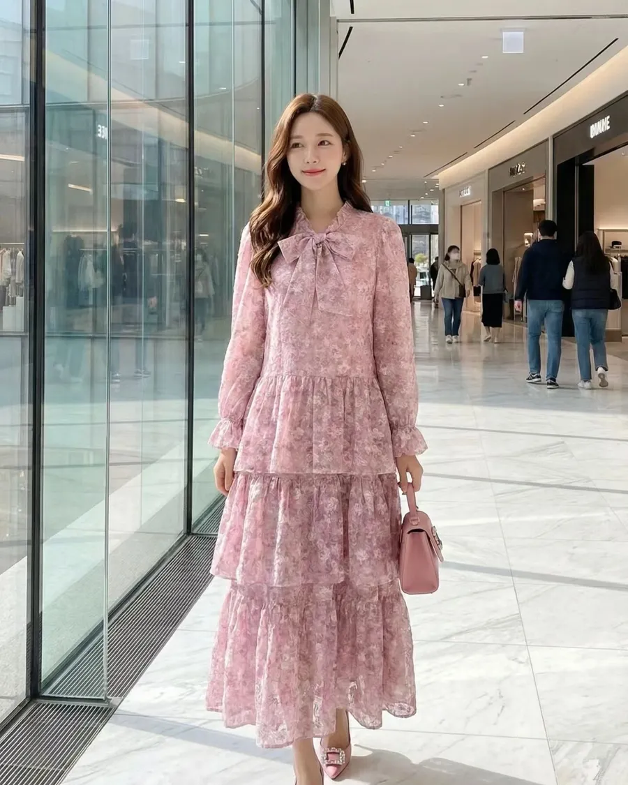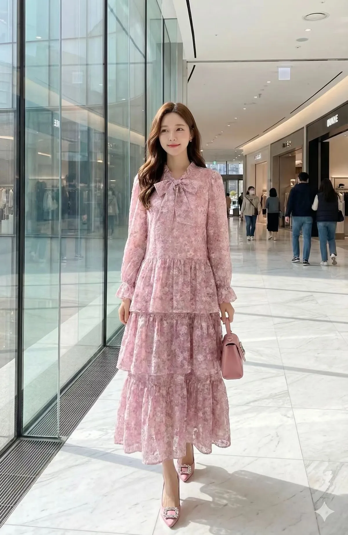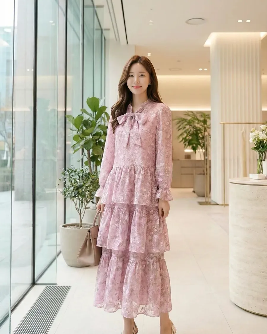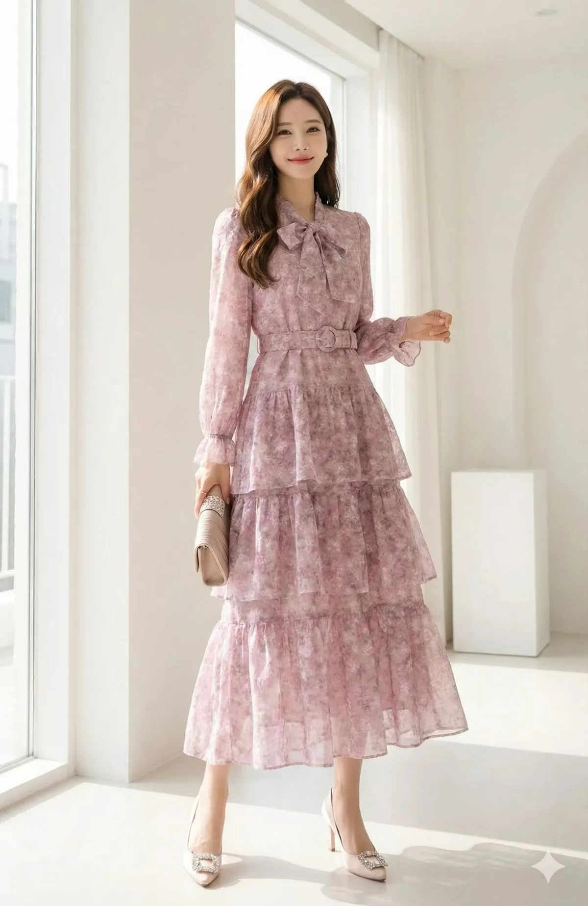 霧粉花影蝴蝶結蕾絲蛋糕連衣裙